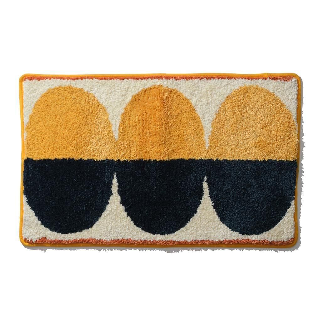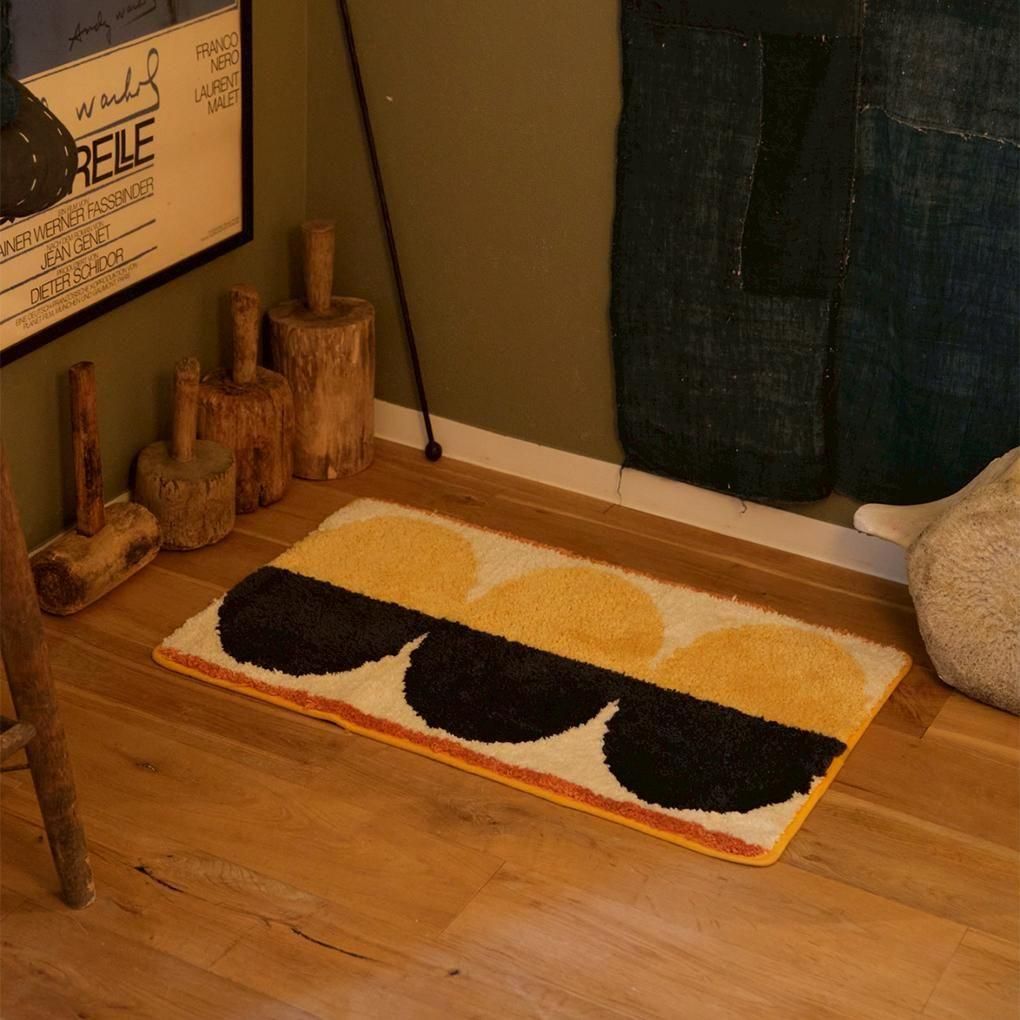 ジオメトリック柄(幾何学模様)で、カラーブロッキングされたデザインが特徴的の、どこでも使いやすい大きさのラグマット。