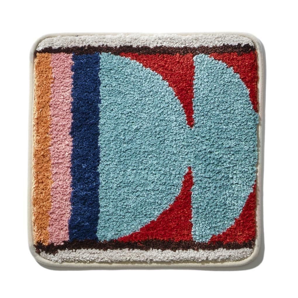 ジオメトリック柄(幾何学模様)で、カラーブロッキングされたデザインが特徴的な、椅子のクッションに最適なサイズのスクエアラグマット。