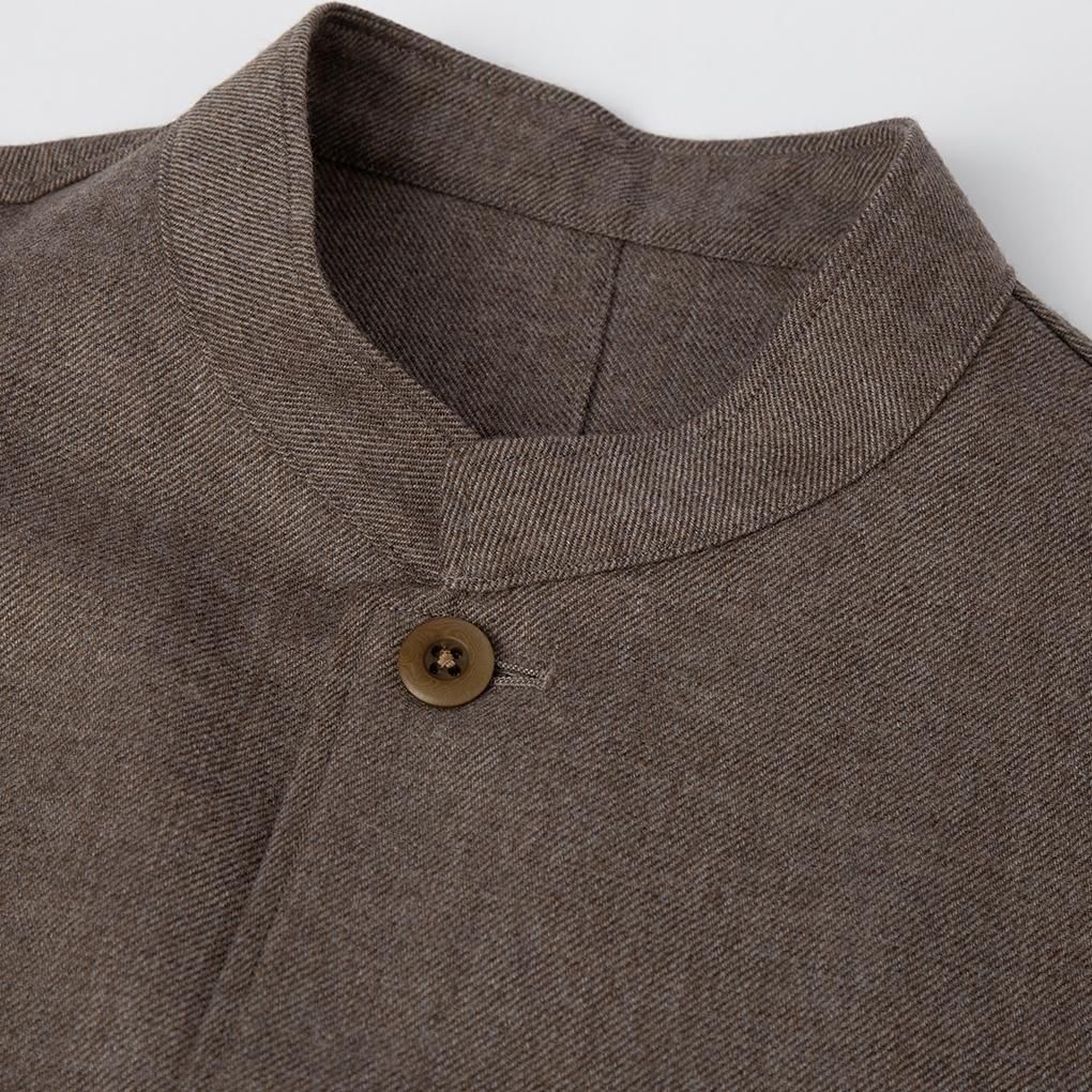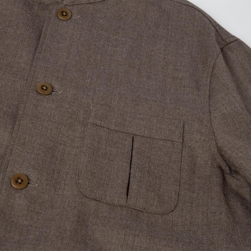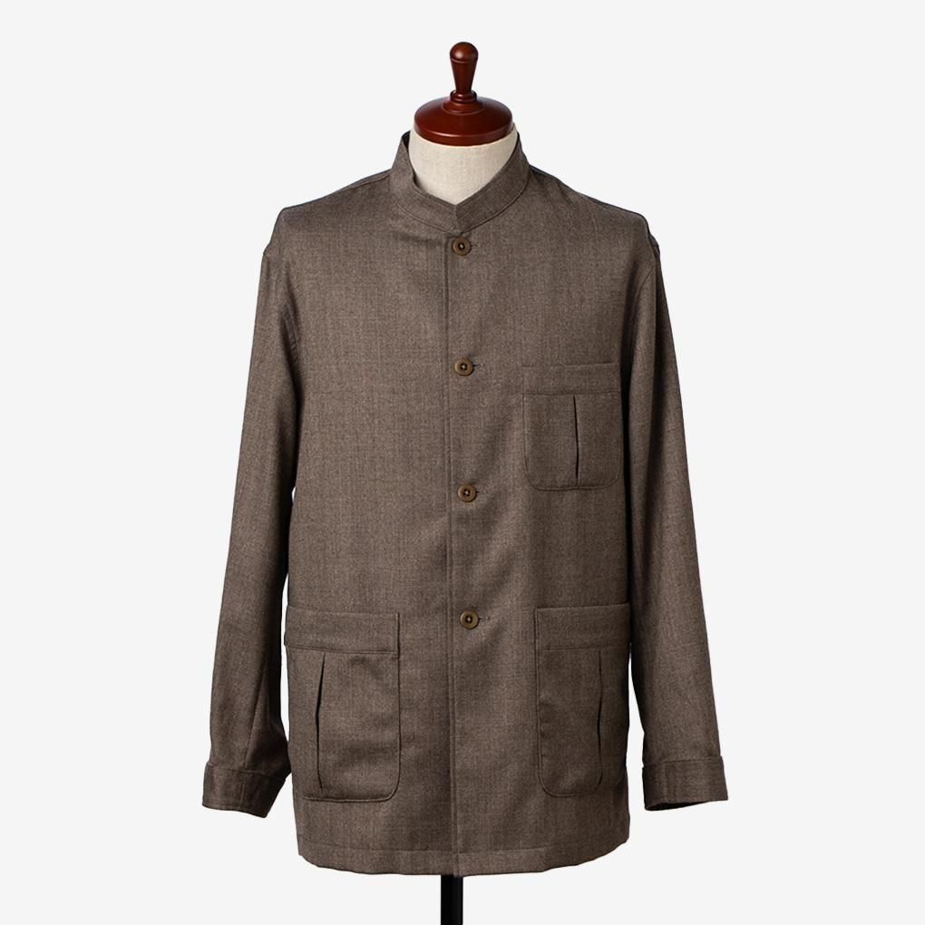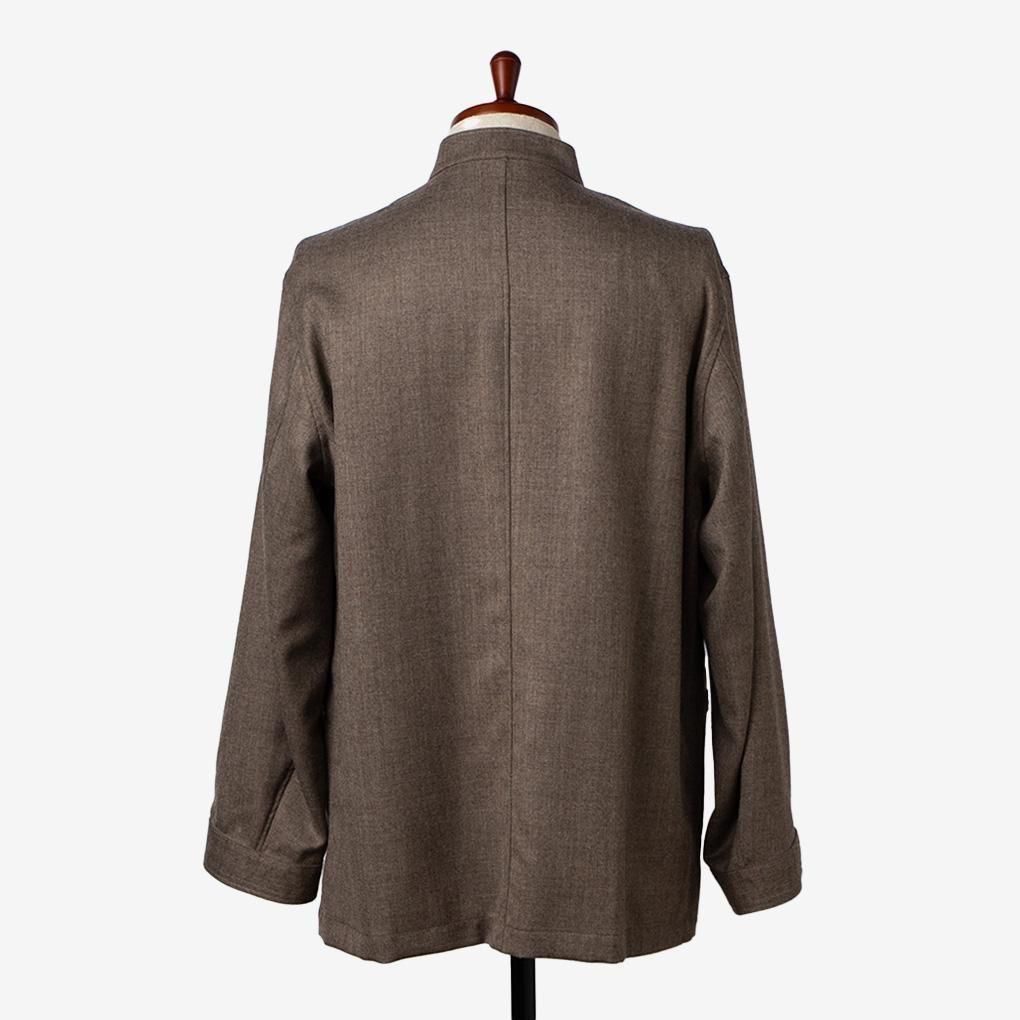 スッキリと見えるマオカラーにインパーテッドプリーツの入ったパッチポケット、袖口はおか付けのカフスと、カジュアルさと上品さを兼ね備えたデザイン。