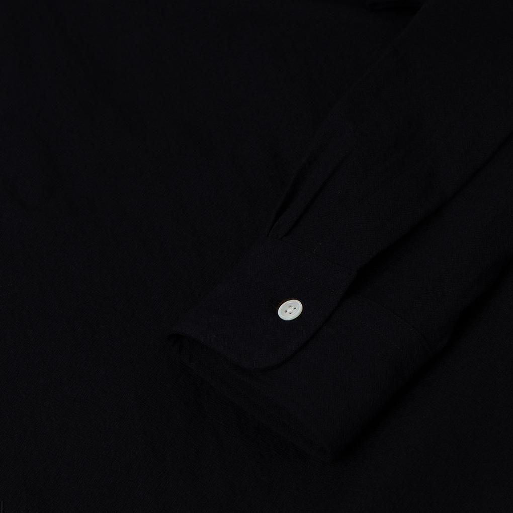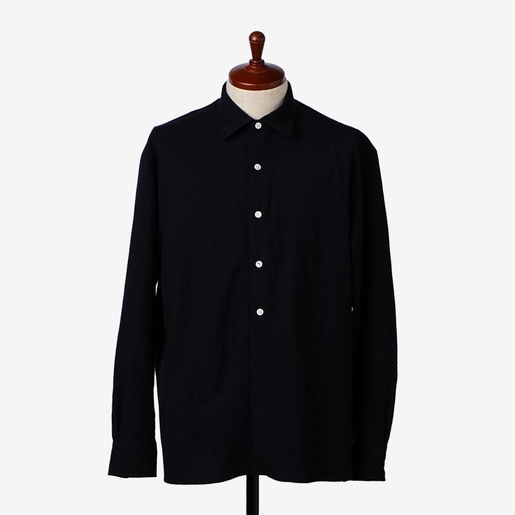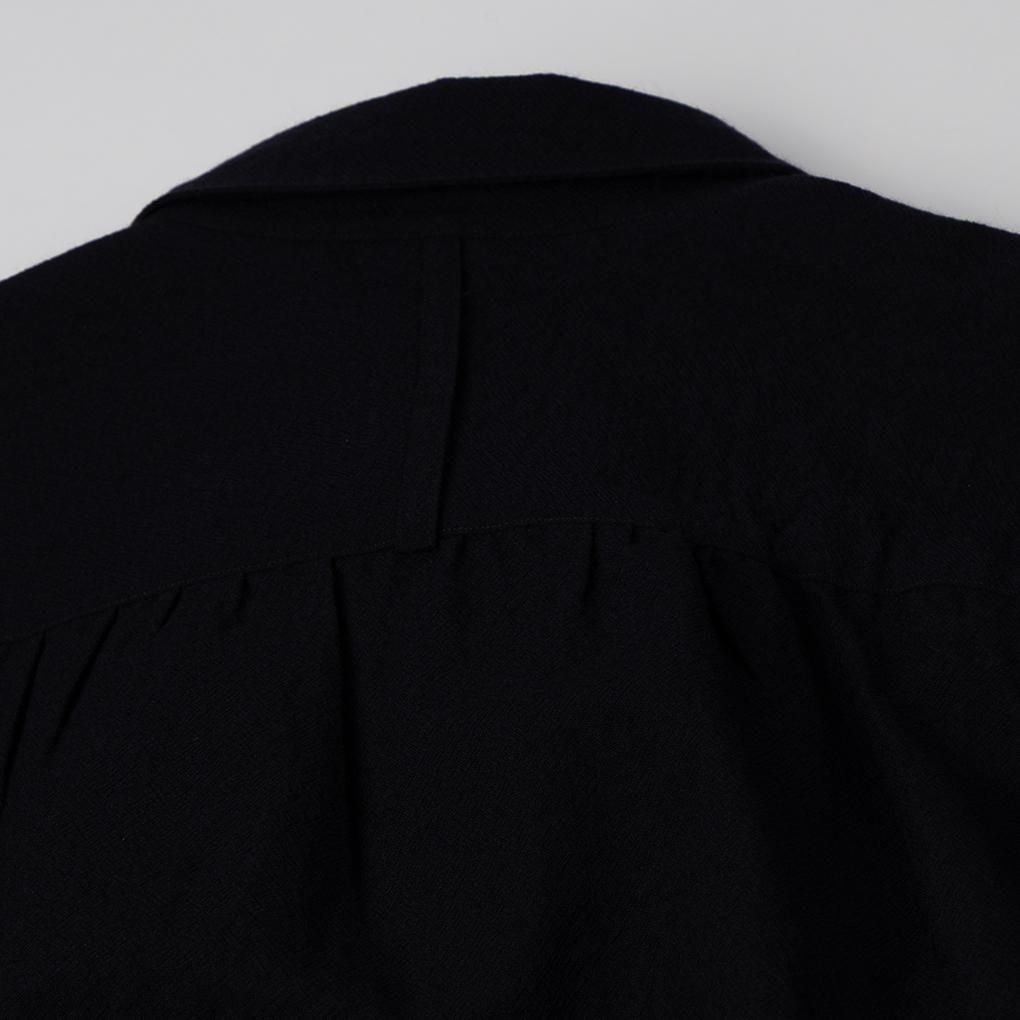 このシワ感を最大限生かすためヨーク下と袖口のギャザー、下から2つのボタンだけを隠した半比翼仕立て、後ろを3cmだけで伸ばしてスリットを入れたスクエアカットの裾など、特徴的なディテールをいれ、全体はシンプルなレギュラーカラーシャツに仕上げている。