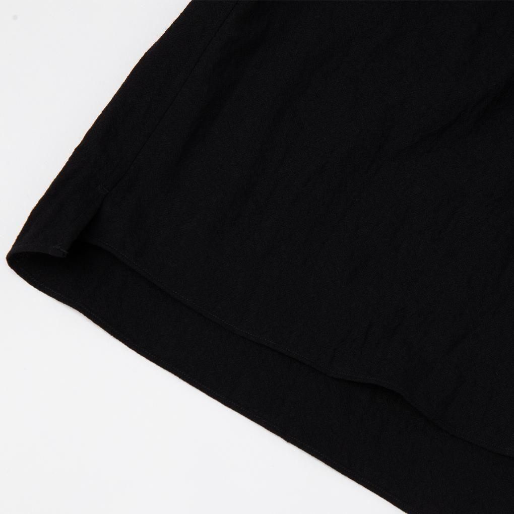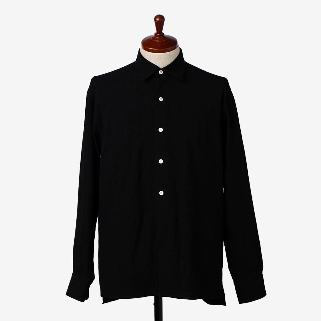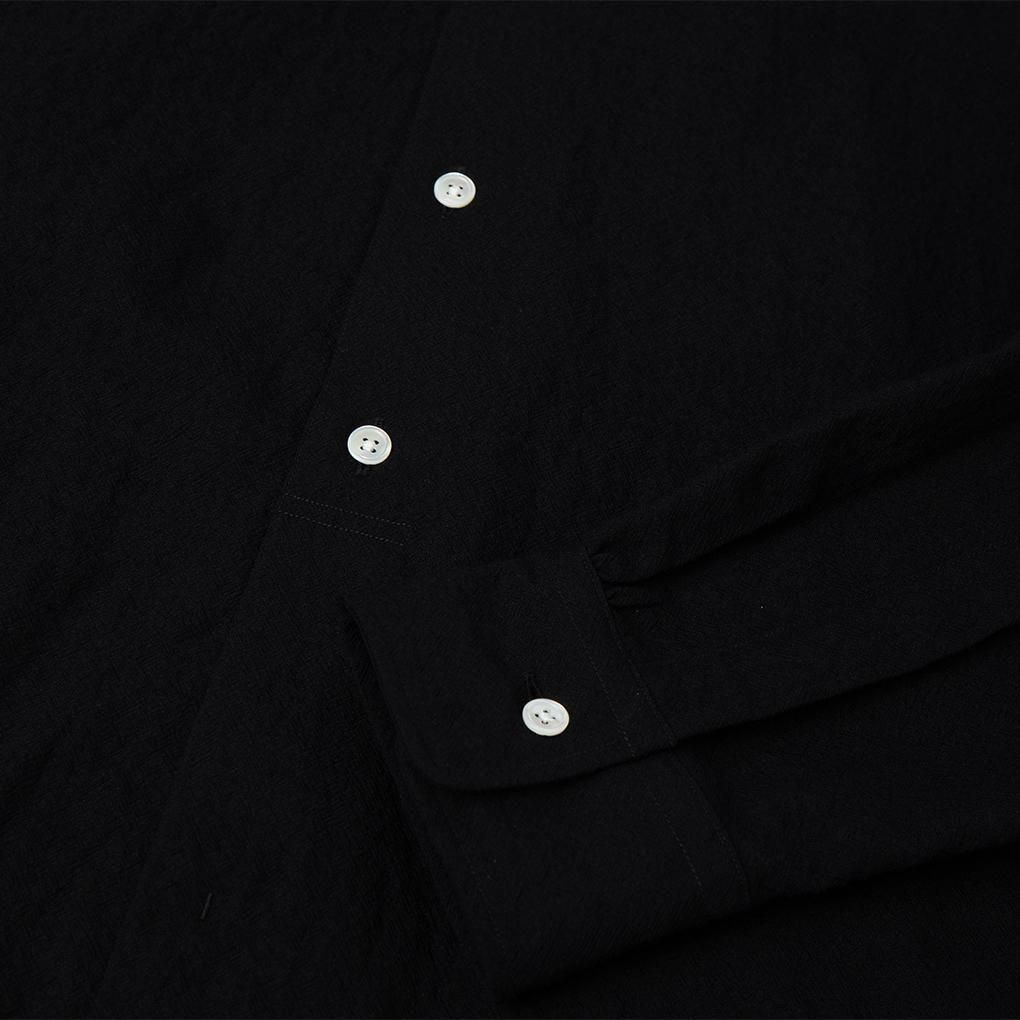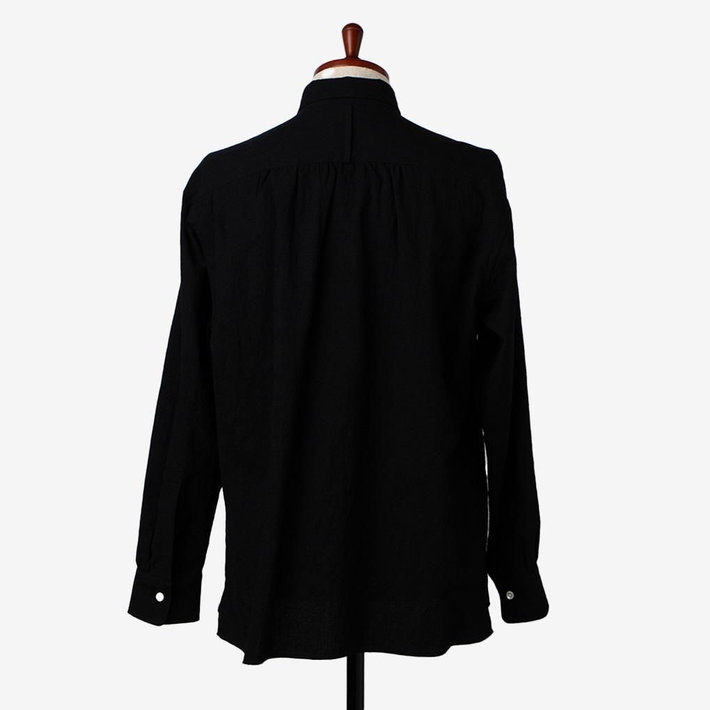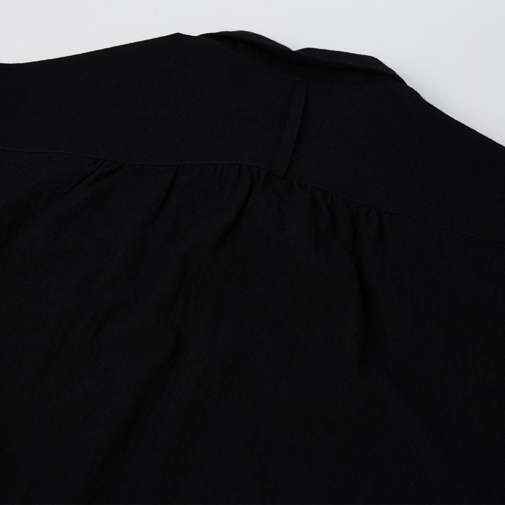 このシワ感を最大限生かすためヨーク下と袖口のギャザー、下から2つのボタンだけを隠した半比翼仕立て、後ろを3cmだけで伸ばしてスリットを入れたスクエアカットの裾など、特徴的なディテールをいれ、全体はシンプルなレギュラーカラーシャツに仕上げている。