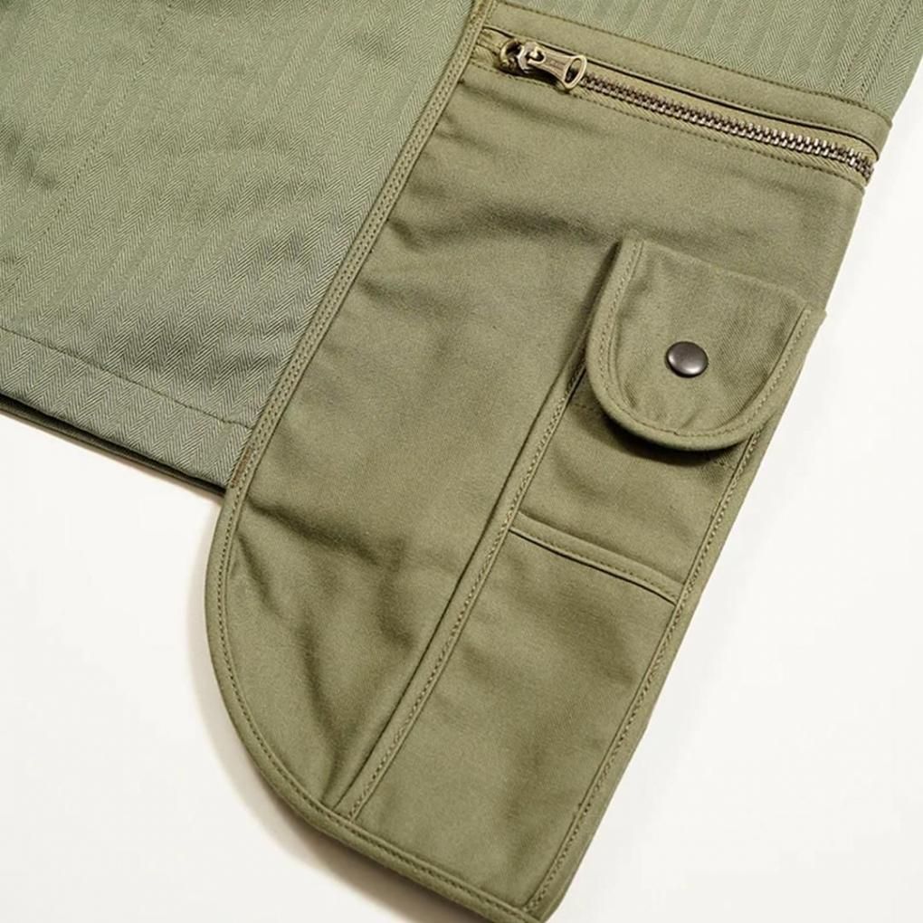 SZヘリンボーン、バックサテンを駆使し大ぶりなポケットが複数付いています。