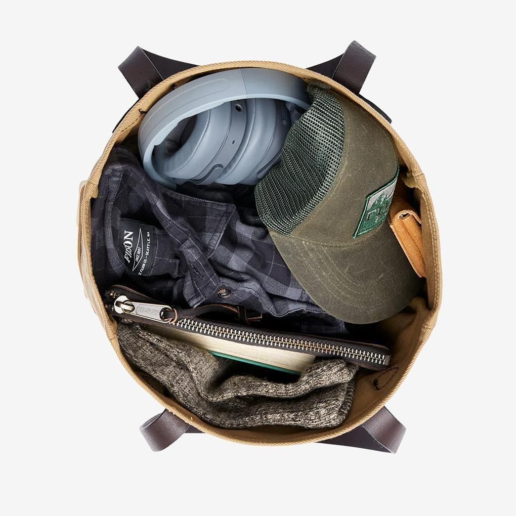 FILSONのバッグの代名詞ともいわれるオープントートバッグ。バックの中身が簡単に取り出せるように大きく開いた口に大きなサイドポケットが2か所とボトルホルダーにもなるポケットが2か所、サイドポケットは様々なすぐに取り出したいものを収納できます。