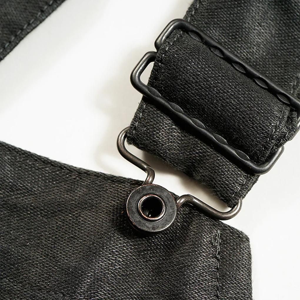 胸当ての仕様は腹部や腰部を保護するための形状です。