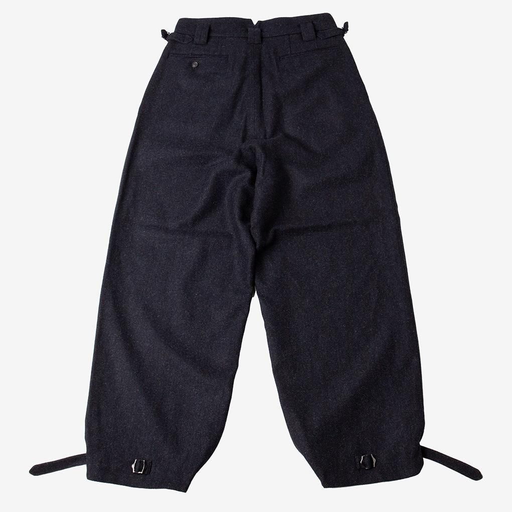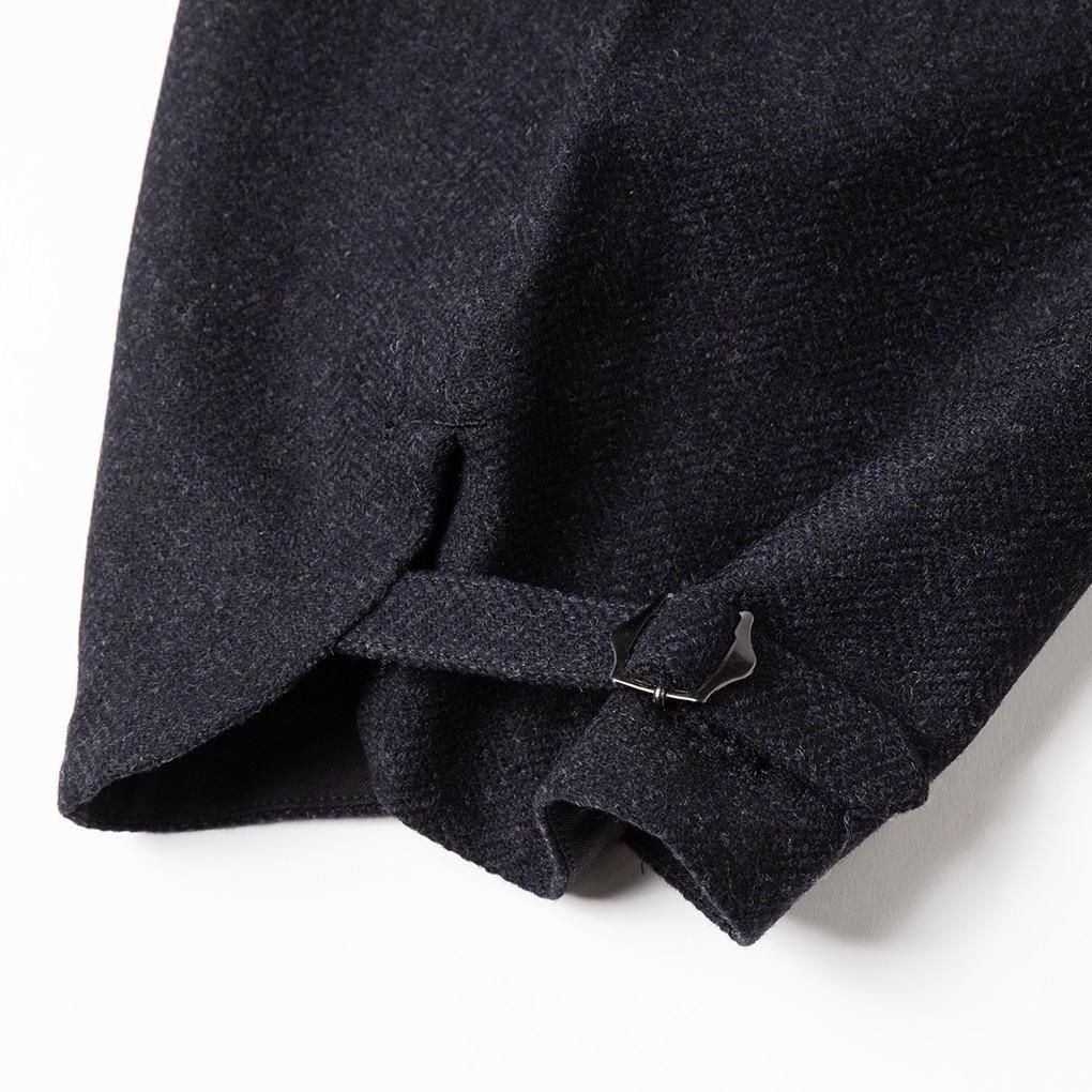 太幅で上端からセットオフされたベルトループやセンターバックのVスリット、サイドシンチにハイウエスト、さらに裾にもストラップとバックルの付いているなど、ドレスパンツの範疇を超え、カジュアルパンツでは見られないデザインは、国内でも縫える工場がほとんどありません。