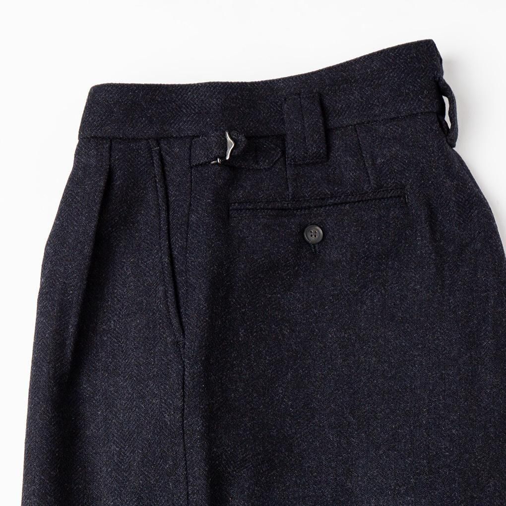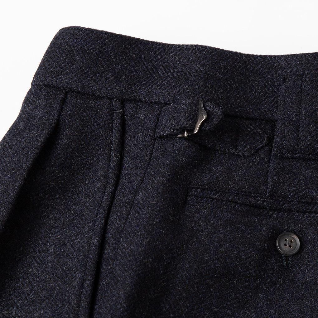ウエストのサイズ調節が可能なサイドシンチや繊細な両玉縁のサイドの切りポケット、内側のサスペンダーボタン、ヒップにも細い両玉縁のピスポケットが付き、ベルトループはタックインの際に個性的なアクセントになるようやや低めの位置に配置されているなど、オーセンティックでありつつ独創的なディテールが目を惹くデザインです。