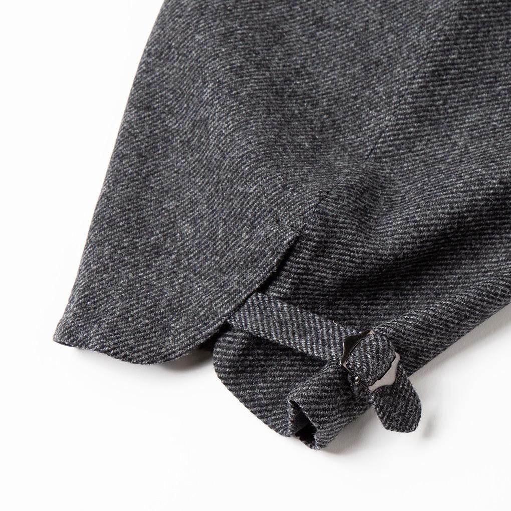 太幅で上端からセットオフされたベルトループやセンターバックのVスリット、サイドシンチにハイウエスト、さらに裾にもストラップとバックルの付いているなど、ドレスパンツの範疇を超え、カジュアルパンツでは見られないデザインは、国内でも縫える工場がほとんどありません。