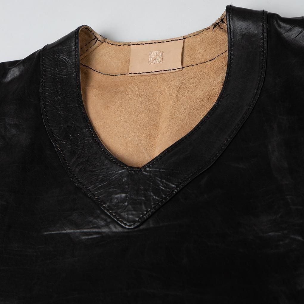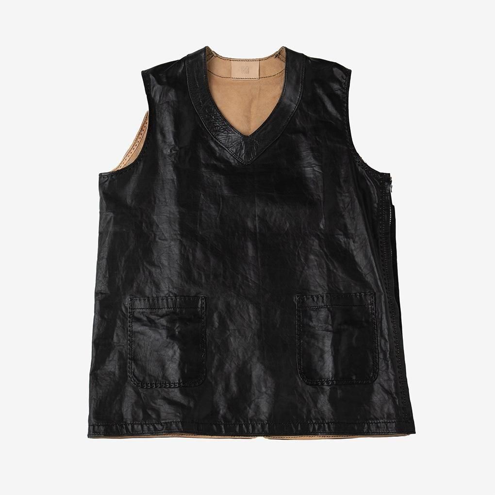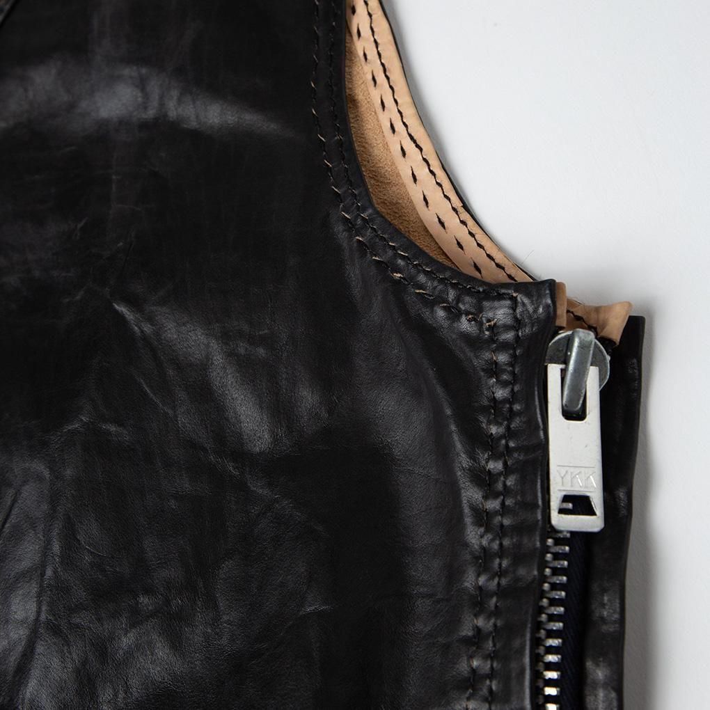 ヴィンテージのフランス軍のベストをベースに作られたもので、身頃一枚のみの生地で制作する型紙のためカーフレザーとしての最大のサイズが必要。